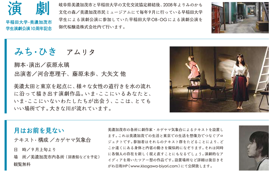 2012年 シアターグリーン学生芸術祭「虚構の恋愛論」旗揚げ、藤原未歩 こりっち賞俳優部門受賞 (東京・シアターグリーンBASE THEATER) 2014年 利賀演劇人コンクール「楽屋〜流れさるものはやがて悲しき〜」(清水邦夫)荻原永璃 奨励賞受賞 (富山・利賀芸術公園リフトシアター) 2015年 奈良・町家の芸術祭はならぁと「から、へ、流れる」滞在製作 (奈良・宇陀松山会場マルカツ) 2016年 第七回公演「わたしたちの算数 あるいは 握手を待つカワウソ、とても遠い犬」 (東京・シアター バビロンの流れのほとりにて) 第八回公演「恋の死とその幽霊」(東京・荻窪小劇場) |